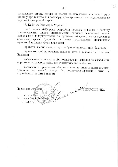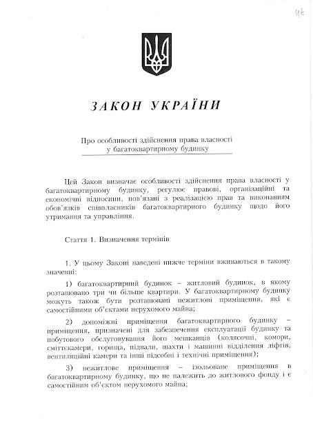1. Надати завірені належним чином фотокопії з оригіналу титульної і останньої сторінок, затвердженого Верховною Радою України Закону України від 14.05.2015 р. № 417-VIII «Про особливості здійснення права власності у багатоквартирному будинку»;