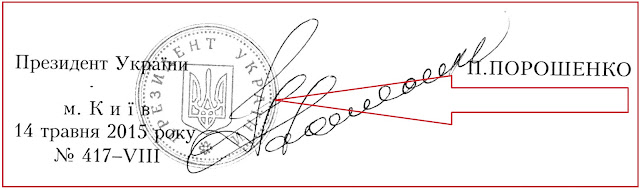 Президента України на оригіналах текстів законів України, указів Президента України, міжнародних договорів України;